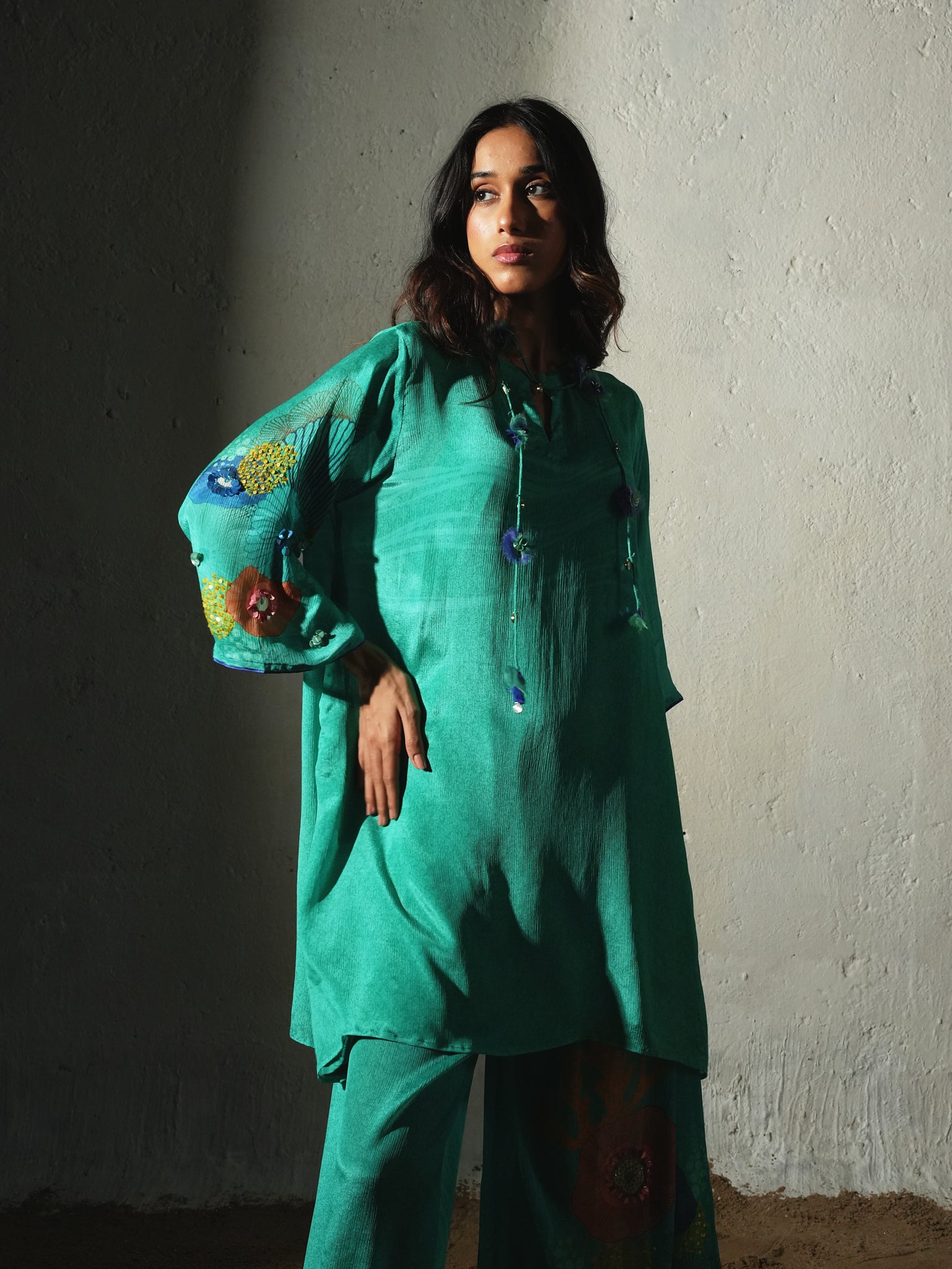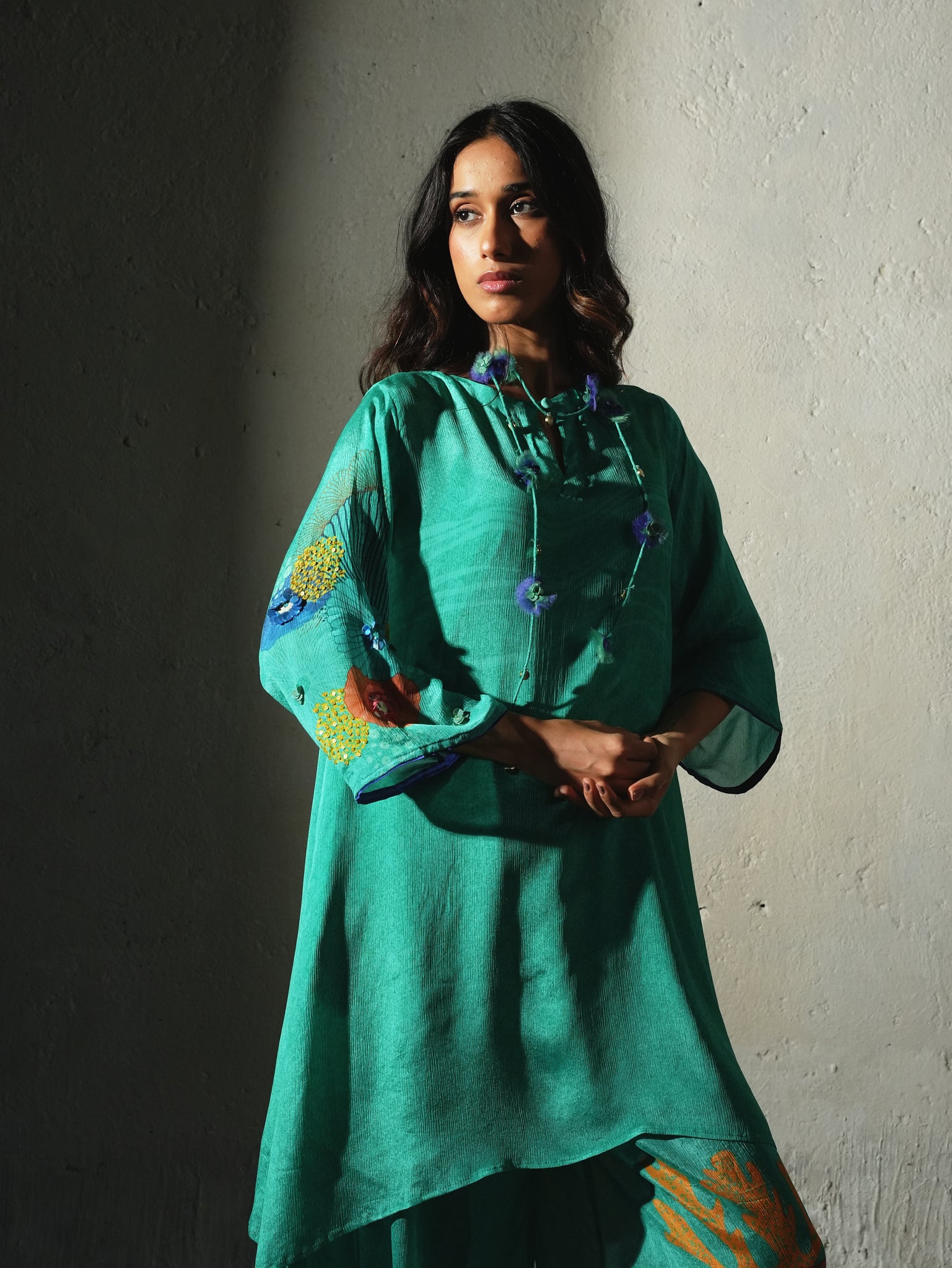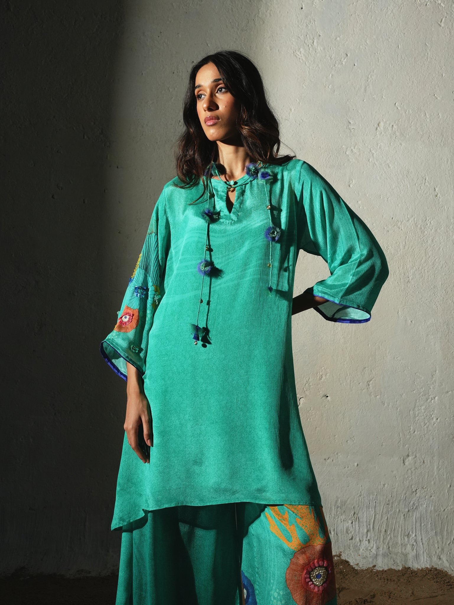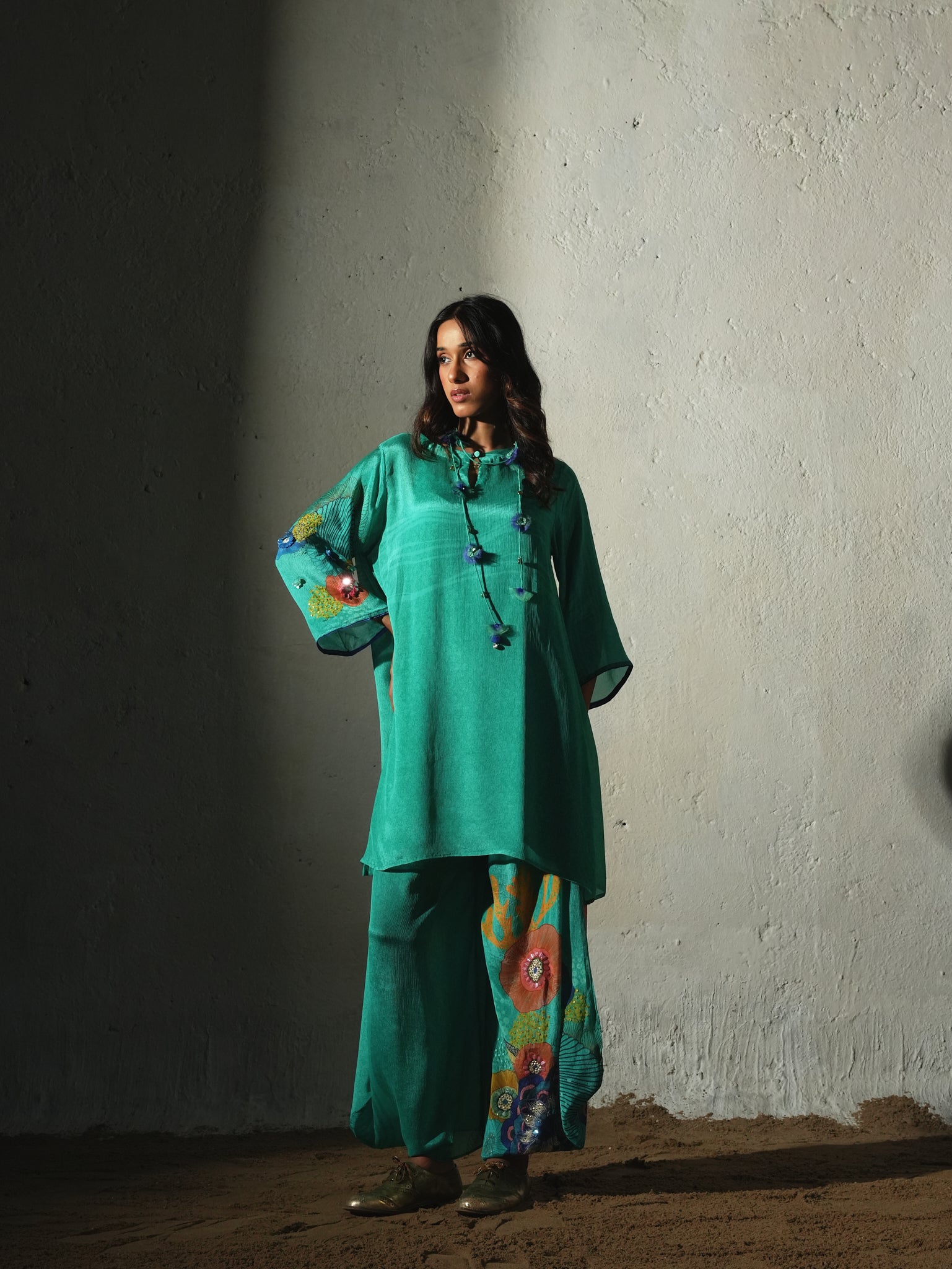A vibrant set in flowy silhouette, elevated with hand detailing, enhancing the look with a finely crafted neck piece