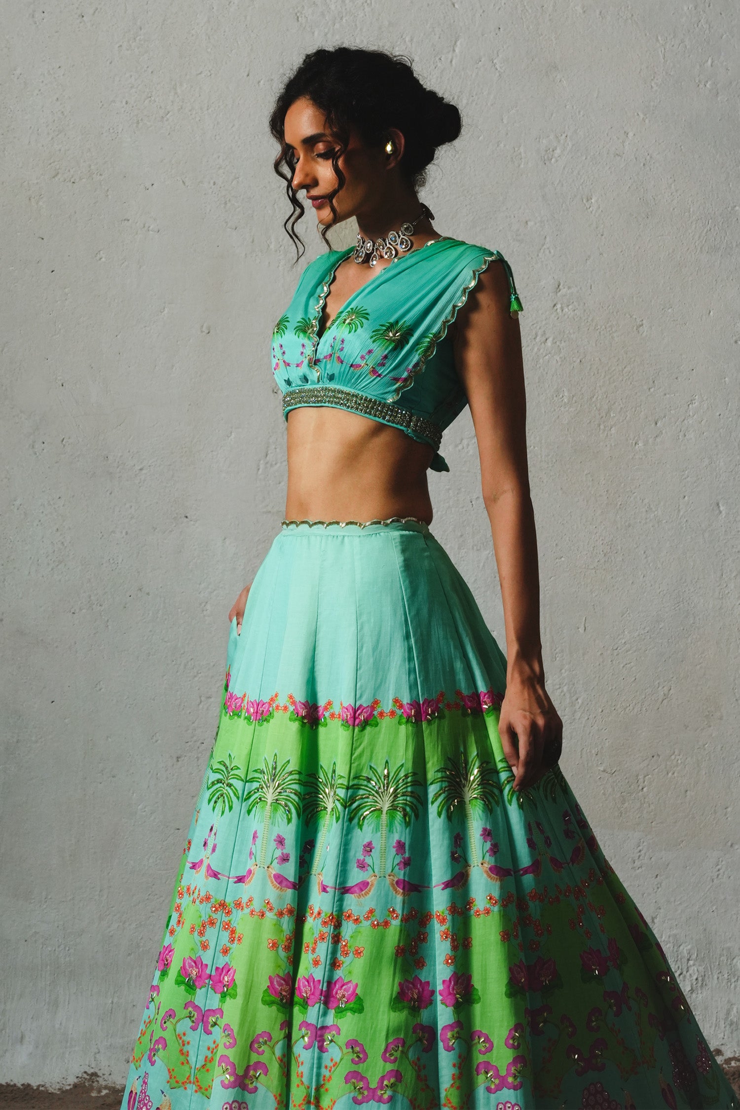 A lehenga set in fresh hues, paired with a playful choli and an ombre dupatta, creating a vibrant look.
