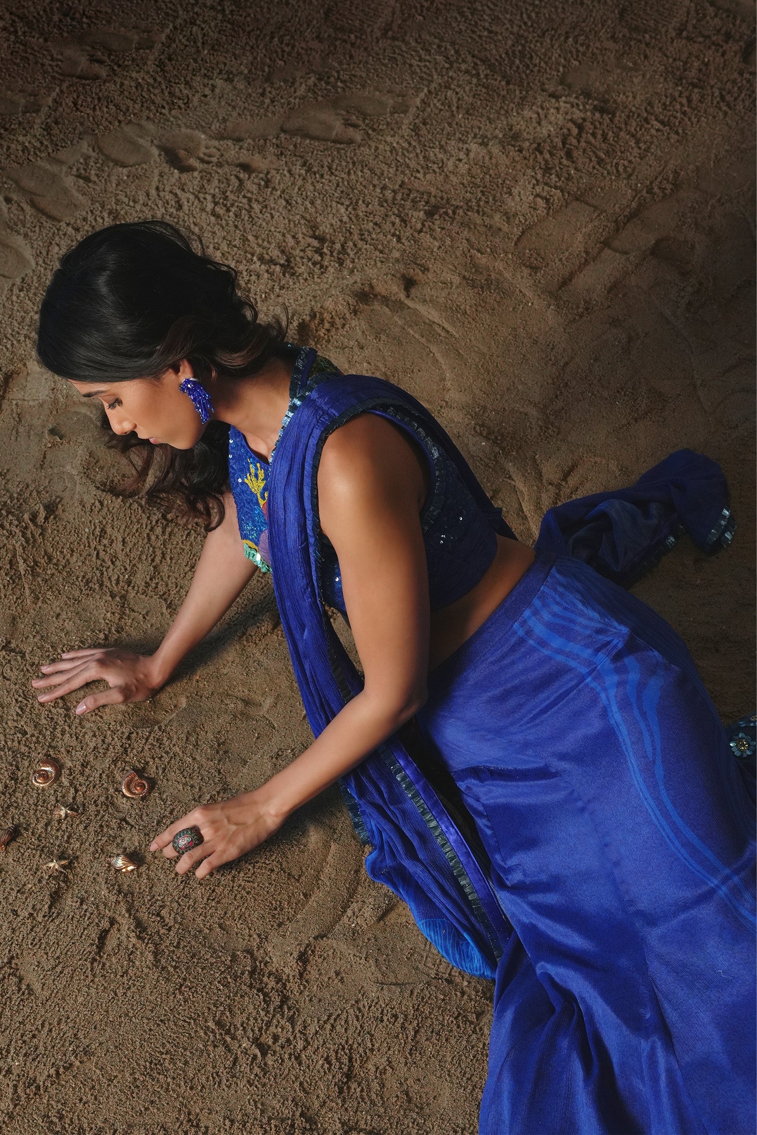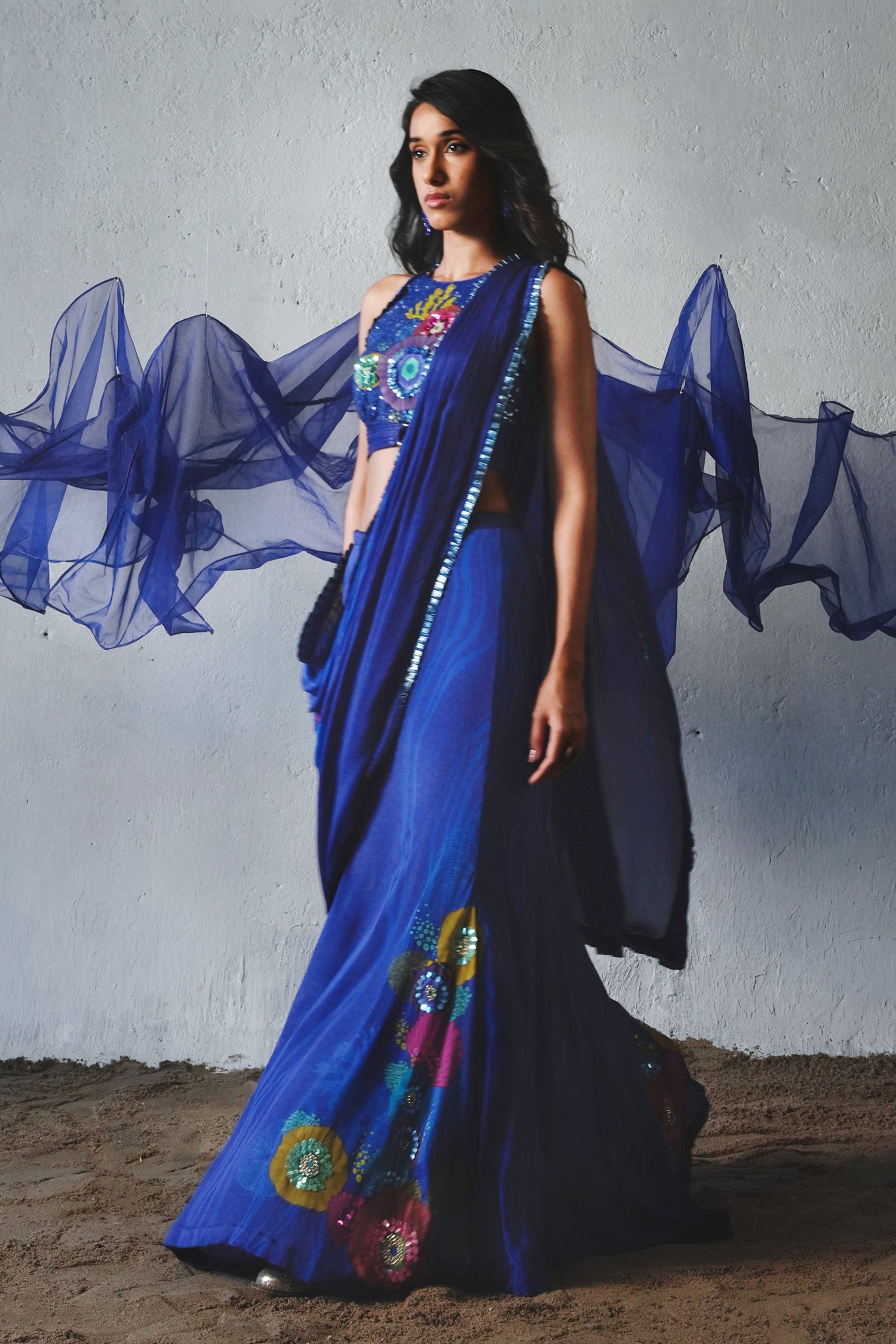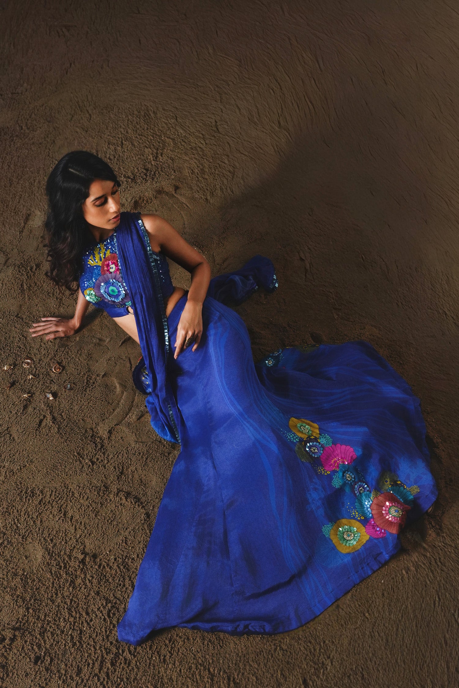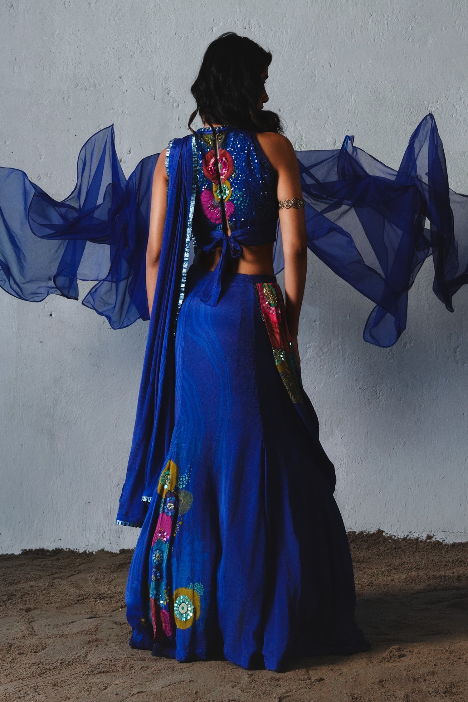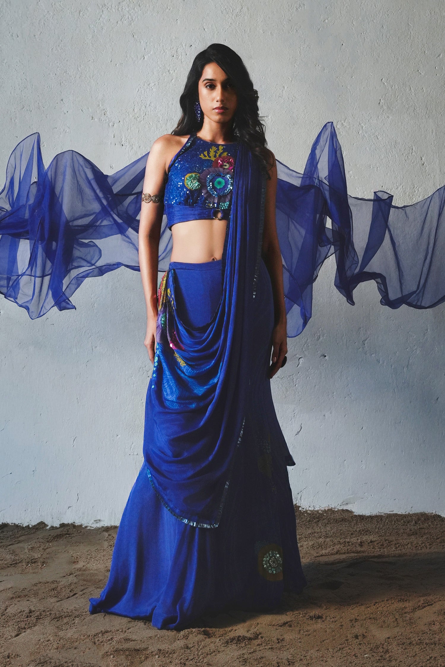 A vibrant mermaid style, sleek pre-draped saree, elevated by a halter neck choli adorned with sequins and fine handwork