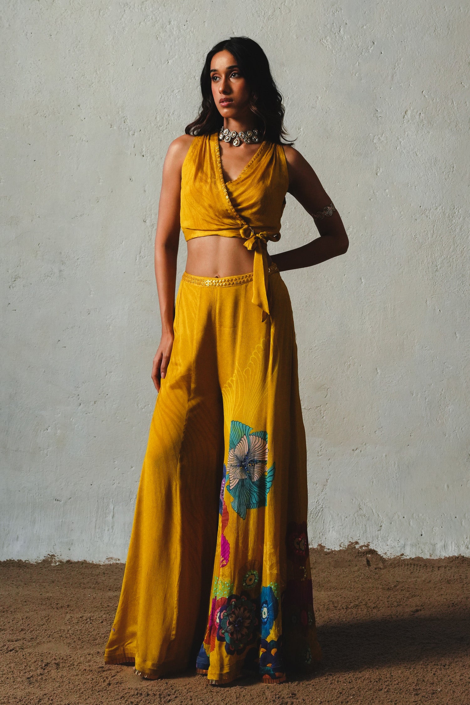 A pant set featuring the perfect touch of flare, paired with a chic wrap-around top meeting the playful charm