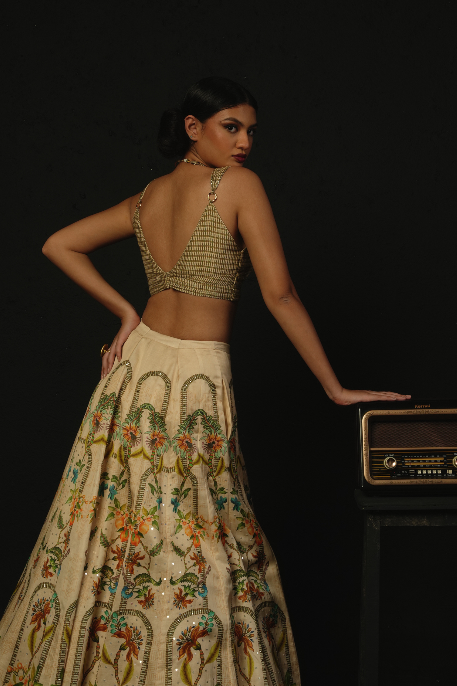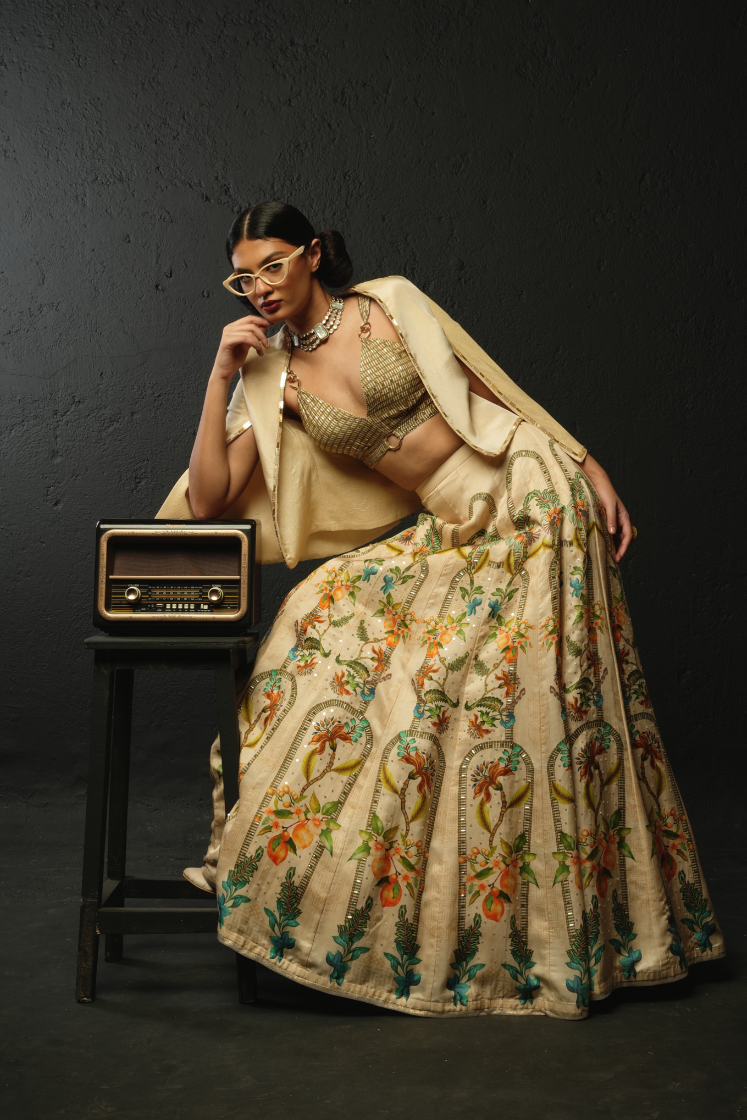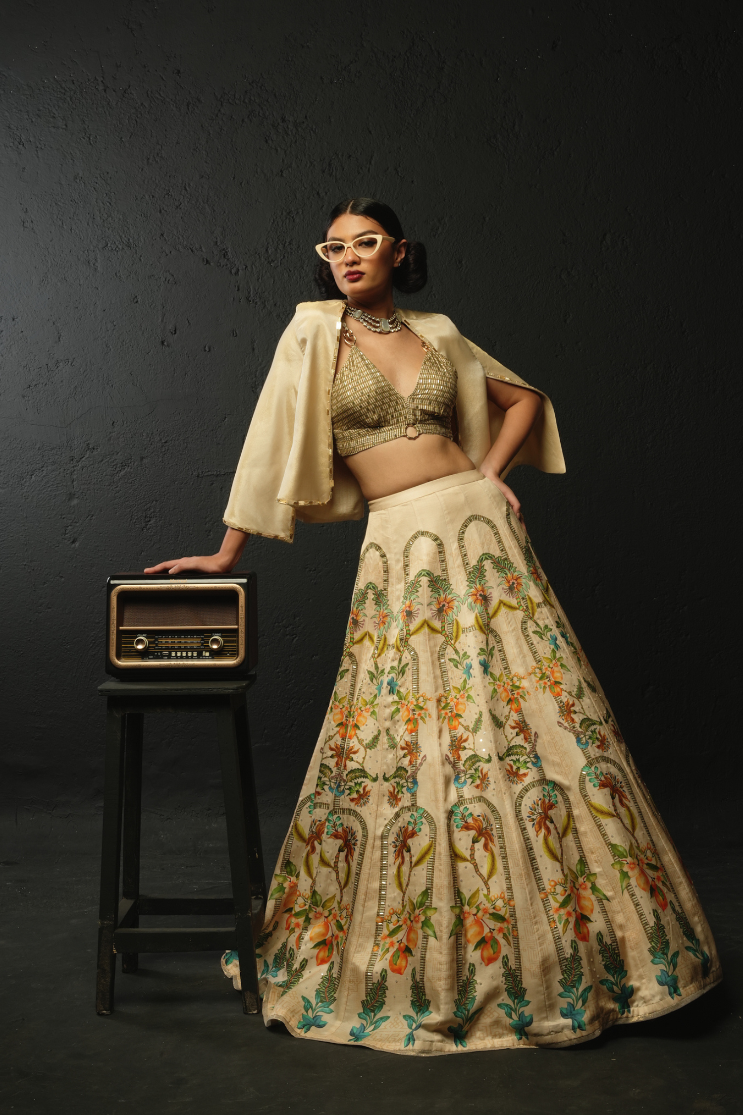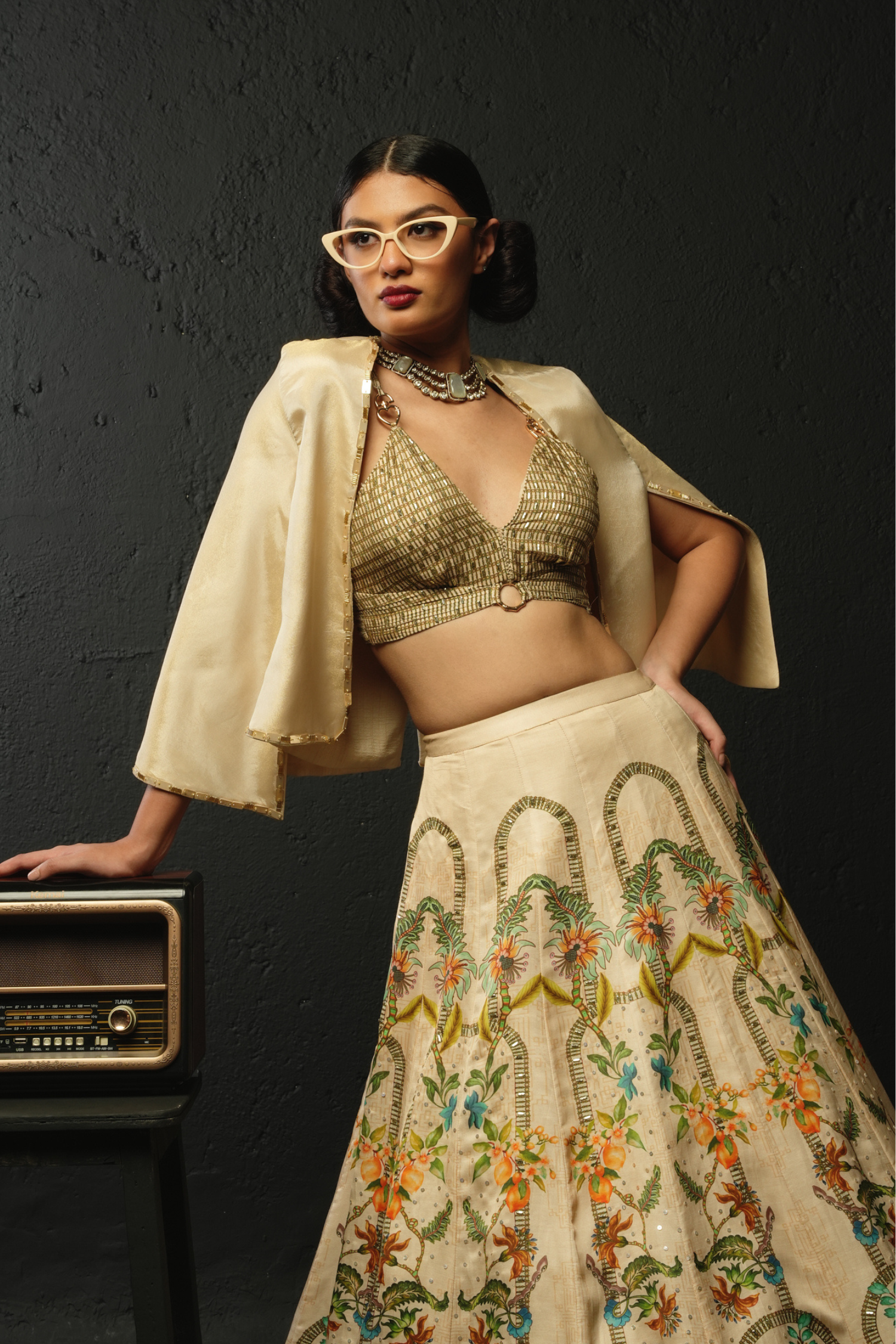 This Lehenga set, Featuring a chic choli and a sleek jacket over lay, re-define modern elegance with its subtle tones.