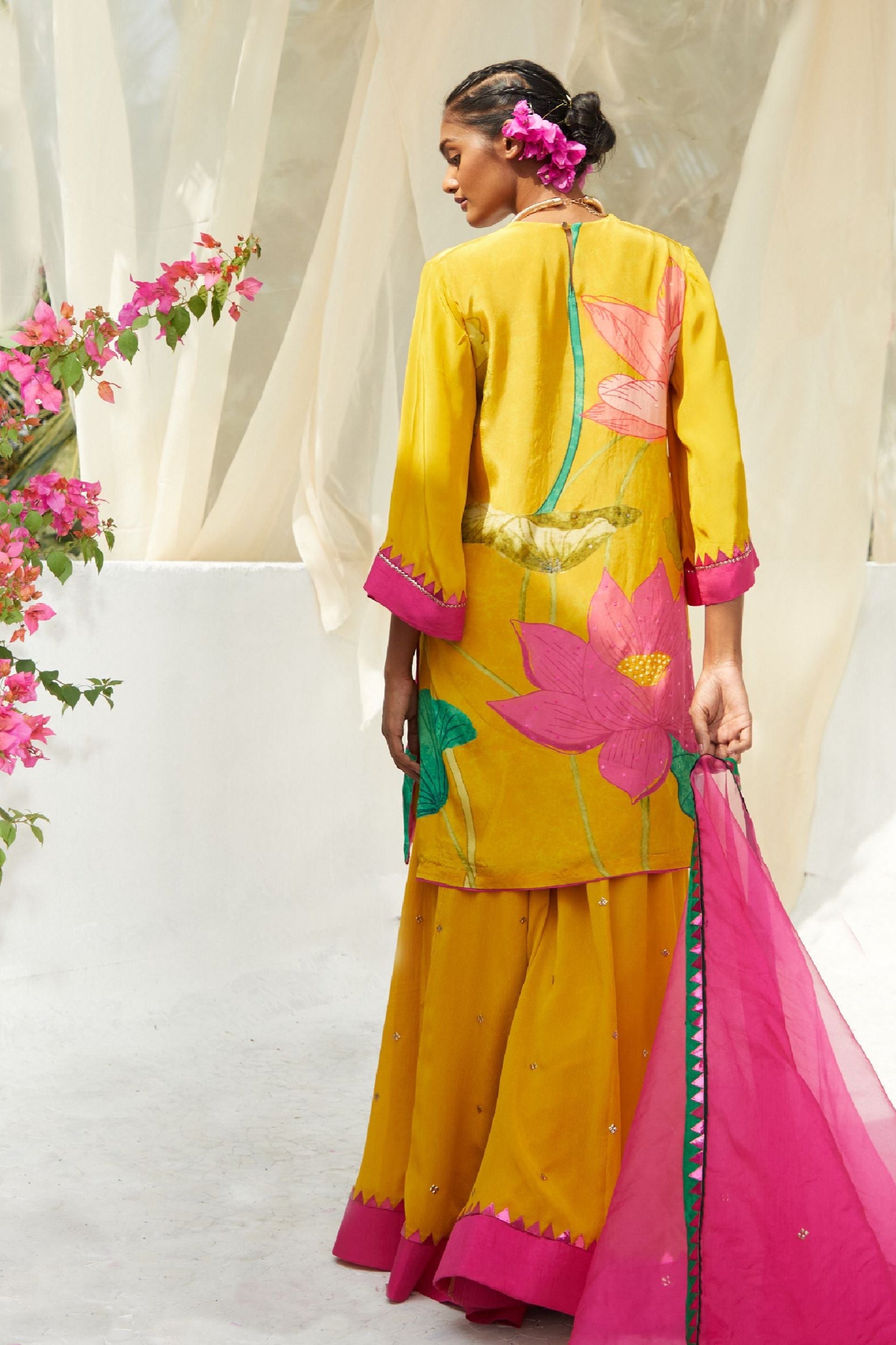 DAZZEL IN OUR YELLOW LOTUS MOTIF SHARARA SET, ADORNED NECKLINE AND SLEEVE - A CHIC AND FASHIONABLE CHOICE TO YOUR HALDI, ADD FLAIR TO YOUR FASHION WITH ORGANZA DUPATTA.